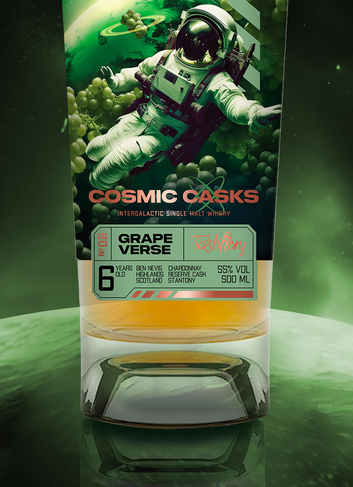 Mit der Cosmic Casks Serie startete Tastillery eine spannende Reihe ungewöhnlicher Whiskys mit einzigartigem Twist. Nach einem grandiosen Auftakt zu Beginn des Jahres mit 01 Smoketopia folgt nun die zweite Abfüllung mit intergalaktischem Finish: 02 Grapeverse.