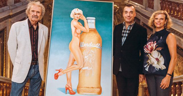 Bildzeile (v.l.): Pop-Art-Ikone Mel Ramos, Almdudler-Geschäftsführer Thomas Klein und Sabine Haag, die Generaldirektorin des Kunsthistorischen Museums, mit dem Gemälde namen „Almdudler’s Fabulous Blonde“.