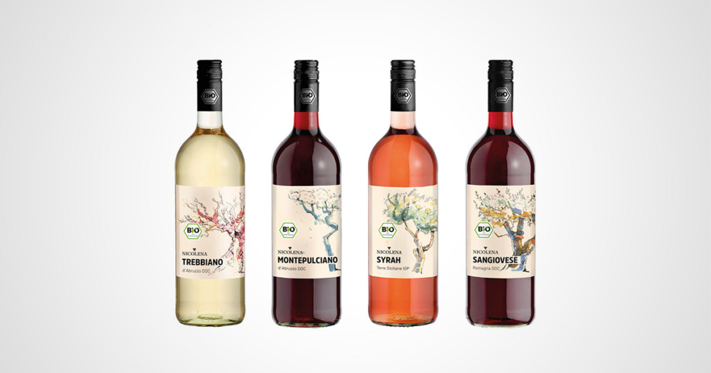 Die Etiketten erhielten ein helles, freundliches Design mit für die jeweilige Weinregion typischen Gehölzen wie Korkeiche, Pinie, Olivenbaum oder Zitrone. Diese wurden von einer Münchner Illustratorin individuell für die Weine gestaltet und bilden mit ihrem feinen Strich und der schönen Kolorierung nun den auffälligen und wertigen Mittelpunkt der Gestaltung. Neu ist auch die prominentere Platzierung des Bio-Logos, mit der man der zunehmenden Bedeutung von Bio-Weinen im Weinmarkt Rechnung trägt und dem Verbraucher eine bessere Orientierung und Entscheidungshilfe bieten will. Unverändert ist das sehr gute Preis-Leistungsverhältnis der veganen DOC-und IGP-Weine, die in Literflaschen vom klassischen Bordeaux-Typ und nur mit Schraubverschluss angeboten werden. Dies schließt Korkfehler aus und macht die Flaschen einfach zu öffnen. Der gegenüber 0,75-Liter Flaschen etwas größere Inhalt macht die Weine zusätzlich ideal für gesellige Anlässe.