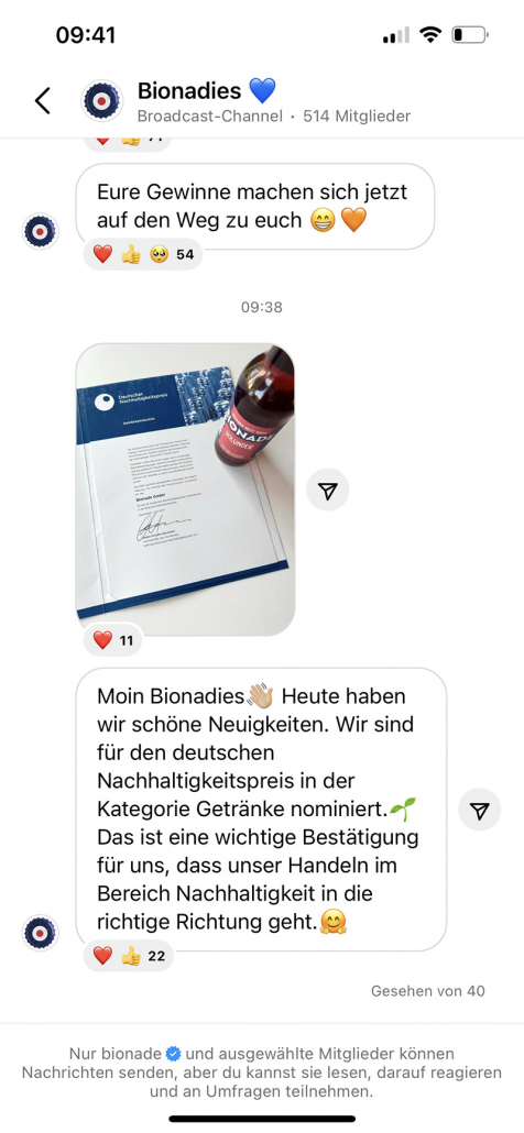 Gestartet war der Broadcast Channel mit einer Aktion zur neuen BIONADE Naturtrübe Blutorange: Bionadies, die dem Kanal beigetreten und auf das dazu veröffentlichte Foto reagiert hatten, konnten eines von 20 Probierpaketen gewinnen. Der Broadcast Channel berichtet aber auch über andere (nicht immer) alltägliche Dinge, die das BIONADE Team beschäftigten – beispielsweise über die Nominierung für den Deutschen Nachhaltigkeitspreis in der Kategorie „Getränkeindustrie“.