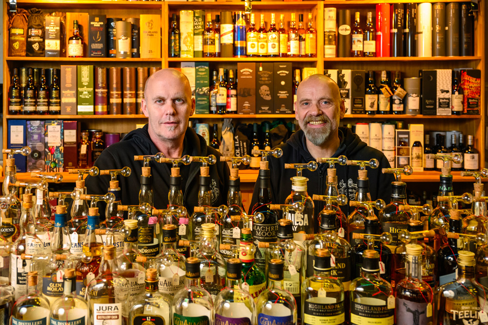 Die meisten Ausstellenden wie hier die Herren von der „Whiskyburg Wittlich“ inmitten ihrer selbst aufgetürmten „Whiskyflaschenburg“ waren mit dem Verlauf des BOTTLE MARKET rundum zufrieden. © M3B GmbH/Oliver Saul