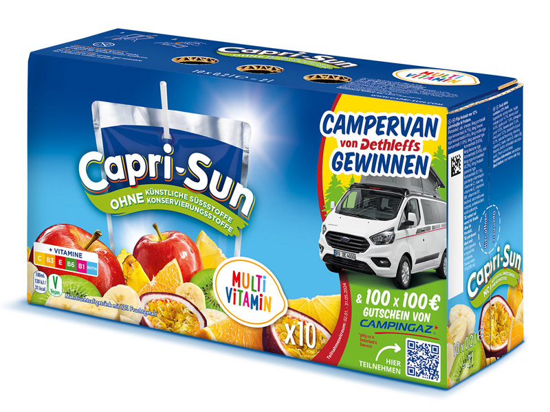 Capri-Sun startet am POS schwungvoll ins neue Jahr: Eine aufmerksamkeitsstark präsentierte Gewinnspiel-Promotion setzt zusätzliche Kaufanreize und stärkt Impulskäufe. In den Märkten wird das Gewinnspiel, bei dem Gutscheine für Camping-Ausrüstung und als Highlight ein Camper Van der Marke Dethleffs verlost werden, mittels Großaufbauten in Form eines Camper Vans und Displays beworben. Auch On-pack wird die Verlosung auf den Zehnerkartons der Sorten Multivitamin und Monsteralarm in Szene gesetzt.