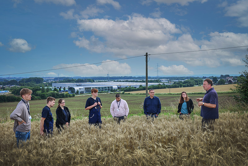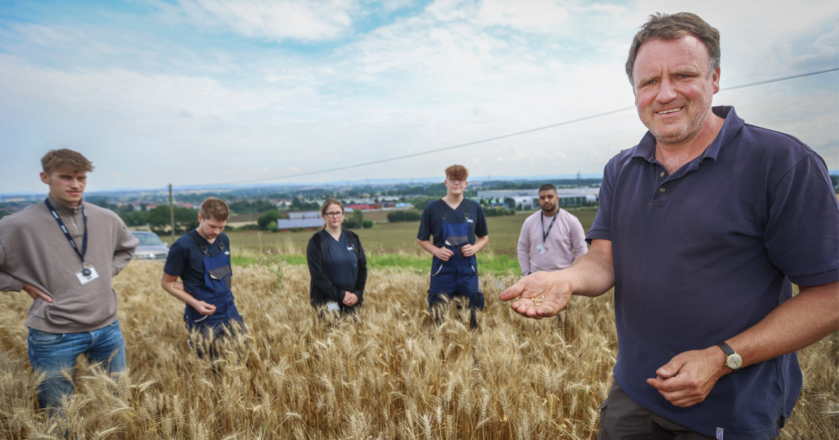 Startpunkt des Azubi-Nachhaltigkeitsprogramms war jetzt ein Besuch von Rüdiger Bobbert bei Carolinen, der den 6 neuen Auszubildenden des ersten Ausbildungsjahres die Felder im Quelleinzugsgebiet gezeigt hat, die er für den Mineralbrunnen bewirtschaftet. Bobbert betreibt zusammen mit seiner Frau Oda Bobbert auf 150 Hektar einen in der Region bekannten Biohof. Auf dem in seinen Ursprüngen bis ins Jahr 1036 zurückreichenden Hof arbeitet man rein ökologisch, ganz ohne Gentechnik, Kunstdünger und chemischen Pflanzenschutzmitteln und streng nach den Bioland-Richtlinien. Dazu gehören auch die Äcker rings um die Quellen von Carolinen in Bielefeld-Ubbedissen, auf denen die Biobauern beispielsweise Getreide und Ackerbohnen anbauen. Bei seinem Besuch erklärte Bobbert den Azubis die Fruchtfolge der Felder, den ökologischen Landbau im Vergleich zum konventionellen Anbau sowie den langfristigen Zusammenhang zwischen Bodenbearbeitung und Mineralwasserqualität.