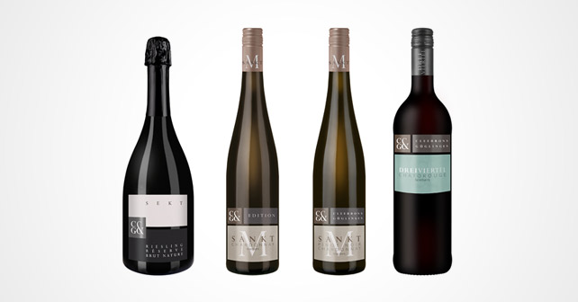 Bildzeile: Neuheiten zur ProWein 2018 von C&G (v. l.): Riesling Sekt Reserve brut nature, Sankt M Chardonnay, Sankt M Pinot Noir & Chardonnay und Dreiviertel „Chatorouge“ feinherb.