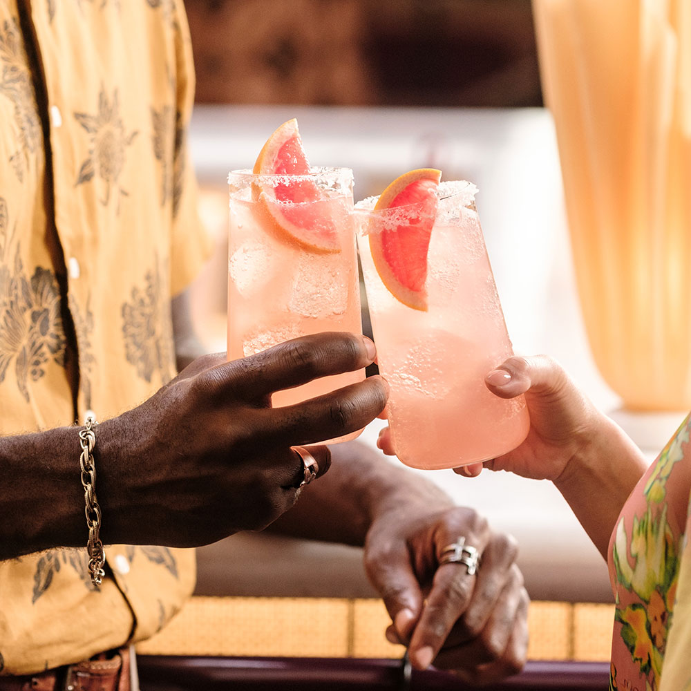 Das Glas mit einem Salzrand verzieren, dann Eis, Tequila und Limettensaft ins Glas geben. Mit Grapefruit-Soda auffüllen und mit einer Grapefruit-Tranche verzieren.