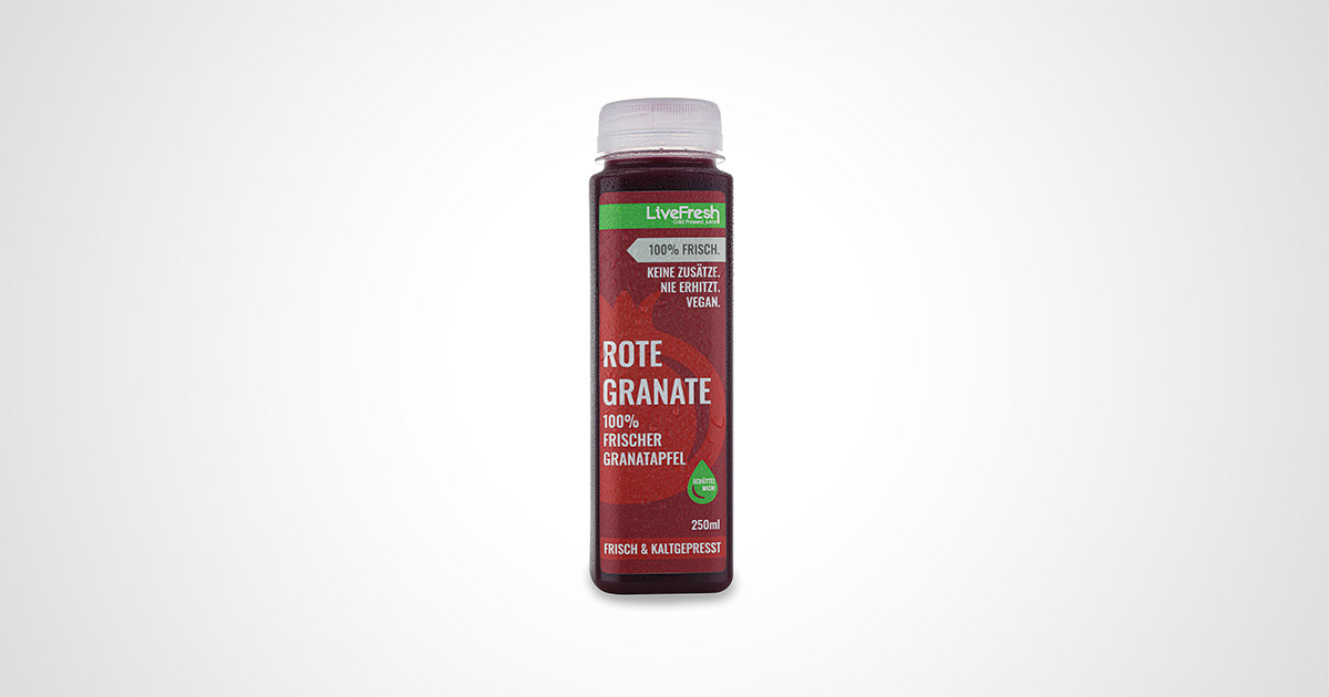 Im Gegensatz zu herkömmlichen Säften sind die kaltgepressten Säfte von LiveFresh komplett zuckerfrei, frei von Zusatzstoffen und 100% natürlich. Durch ein innovatives Haltbarkeitsverfahren gelingt es der aufstrebenden Saftmanufaktur vom Bodensee überdies sicherzustellen, dass der leckere Granatapfelsaft anstatt 2-3 Tage bis zu 6 Wochen den vollen Geschmack behält. Im Vergleich zu pasteurisiertem Granatapfelsaft bleiben außerdem mehr Inhaltsstoffe erhalten, sodass der frische Granatapfelsaft nicht nur köstlich, sondern auch gesund ist.