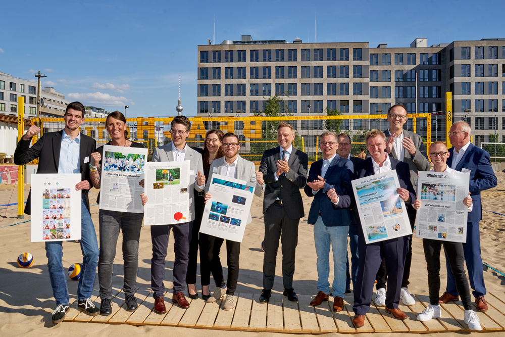 Christian Lindner gratulierte im Rahmen des VDL-Branchentreffs den Veltins-Lokalsportpreis-Gewinnern und lobte das journalistische Engagement (v.l.): Jan Beigelbeck (Heidenheimer Zeitung), Michi Bauer (Main-Post/Schweinfurter Tagblatt), Florian Runte (Siegener Zeitung), Leonie Rothacker und Philipp Durillo (u.a. Darmstädter Echo), Christian Lindner (Bundesfinanzminister), Martin Wieske (VDL), Ralf Leineweber (Cellesche Zeitung, Jury-Mitglied), Jörg Lühn (Dithmarsche Landeszeitung), Andreas Dach (Remscheider General-Anzeiger, Jury-Mitglied), Noah Wedel (Mindener Tagblatt) und Ulrich Biene (Brauerei C. & A. Veltins, Jury-Mitglied). (Foto: VDL / Frank Nürnberger)