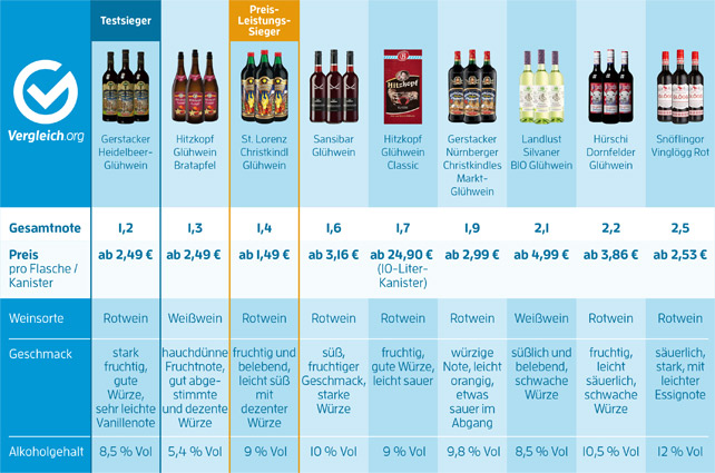 - Den Titel holt der “Heidelbeer-Glühwein” von Gerstacker (Note 1,2, ab 2,49€ pro Flasche). Mit seinem ausgefallen-fruchtigen Geschmack begeisterte er die Tester.