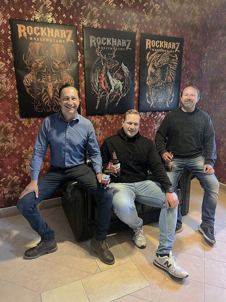 V.l.n.r.: Christian Neuhäuser (Verkaufsleiter Gastronomie und GFGH, AB InBev), Fabian Rudloff (Leiter Gastronomie ROCKHARZ), Thorsten Kohlrausch (CEO Veruga GmbH, ROCKHARZ)