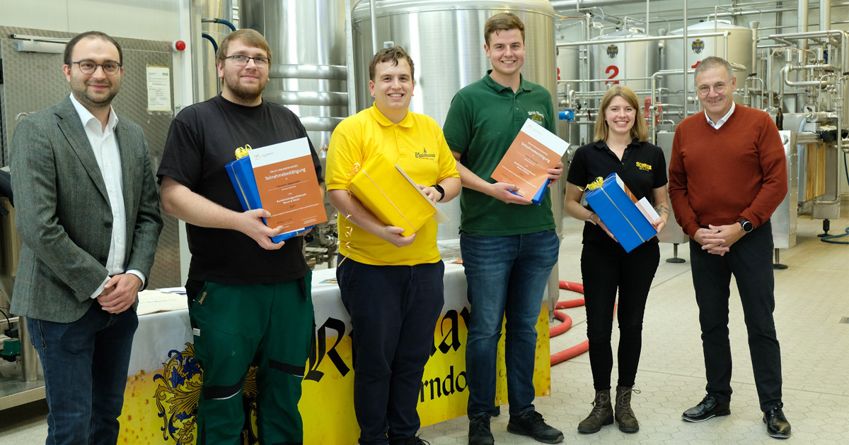 Bildunterschrift: Die Teilnehmer des diesjährigen Bundesleistungswettbewerbs im Brauer und Mälzer-Handwerk (v.r.): Georg Rittmayer, Brauereiinhaber und Präsident Private Brauereien Bayern e.V., Marie-Christine Winter, Bundessieger Julian Dirnhofer, Philipp Nitsche, Clemens Jägermann, Benedikt Meier, Private Brauereien Bayern e.V.