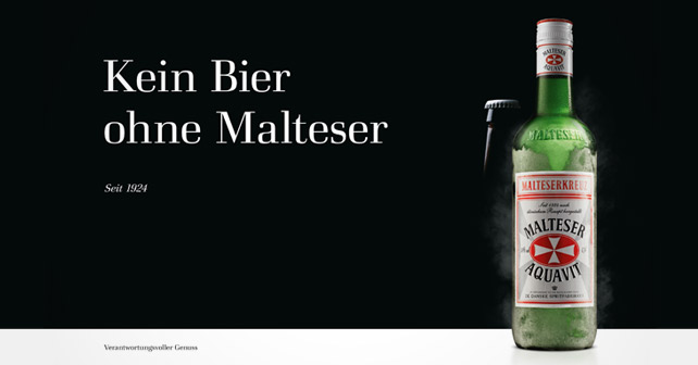 Das Motiv ist puristisch, klar strukturiert und bringt das Konzept textlich wie bildlich auf den Punkt: Schwarz auf weiß leuchtet das Motto auf der linken Seite bis über die Mitte. Frostspuren und Eisdämpfe zeichnen die markante grüne Flasche auf der rechten Seite nach, denn Malteserkreuz Aquavit trinkt man am besten eiskalt. Neben ihr deutet sich der Umriss einer Bierflasche an, da die kräftige Kümmelnote des Aquavits mit den deutschen Wurzeln besonders gut zum Bier passt – eben Kein Bier ohne Malteser.