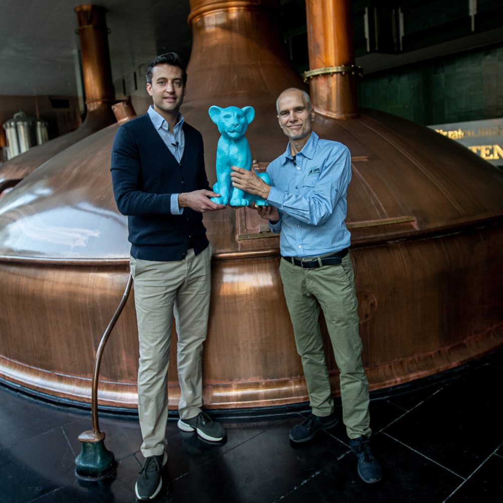 Peter Cermak, Geschäftsführer der Spaten-Löwenbräu GmbH (l.), und Lars Gorschlüter, Gründer des SAVE Wildlife Conservation Fund (r.), mit dem Löwen.