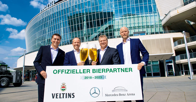Die Privatbrauerei C. & A. Veltins, Meschede-Grevenstein, hält von nun an die exklusiven Ausschankrechte in der Mercedes-Benz Arena Berlin. Die Kooperation mit der Anschutz Entertainment Group beinhaltet darüber hinaus zusätzliche Werberechte in der Arena, aber auch eine weitere Präsenz auf dem neu entstehenden Mercedes Platz zwischen Veranstaltungslocation und Spreeufer.