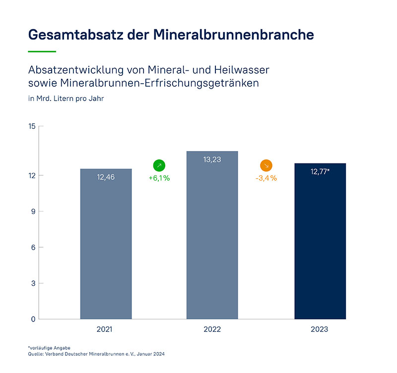 Mit einem Pro-Kopf-Verbrauch von 123 Litern ist Mineralwasser jedoch weiterhin der beliebteste Durstlöscher der Menschen in Deutschland. Der Gesamtabsatz der Mineralbrunnenbranche bezogen auf Mineralwasser, Heilwasser und Mineralbrunnen-Erfrischungsgetränke ist 2023 um 3,4 Prozent auf insgesamt 12,8 Milliarden Liter zurückgegangen.