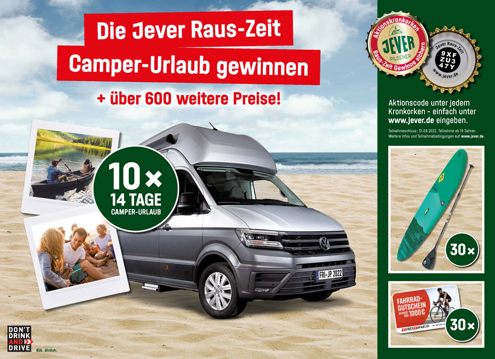 Unter allen Teilnehmenden verlost das Friesisch-Herbe ab sofort zehn 14-tägige Camper-Urlaube mit einem VW Grand California, Fahrrad-Gutscheine, Stand Up Paddling-Equipment, Reisetaschen und Strandtücher für die „Jever Raus-Zeit“.