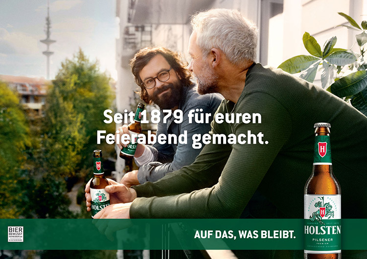 Die Mitarbeiter repräsentieren das „von uns gemacht“, die externen Darsteller in den finalen Genussmomenten das „für euch gemacht“. Das modulare Konzept ist für den Einsatz in Online-Formaten und auf Social Media konzipiert. Die unkonventionelle und frische Anmutung verdeutlicht die Neupositionierung und den Anspruch, die Verwenderschaft zu öffnen und zu erweitern. Verstärkt wird dies durch die Tatsache, dass eine Frauenstimme den Spot begleitet – in der Bier-Werbung noch immer eine Besonderheit, aber für Holsten im Rahmen der großen Markenveränderung naheliegend. Die digitale Kampagne wird durch Out-of-Home-Platzierungen mit Feierabend-Motiven ergänzt.