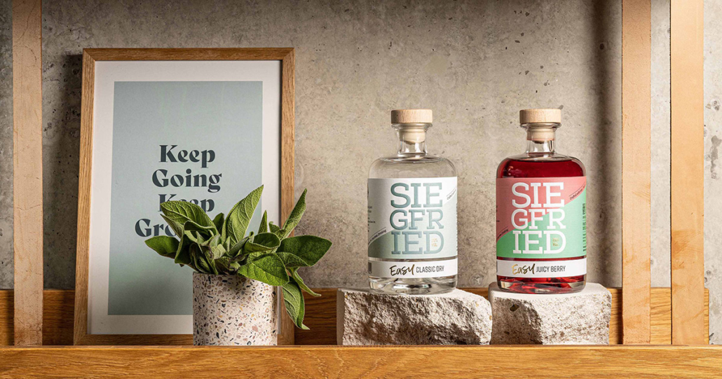 Der Rheinland Dry Gin (41 Vol.-%), die neuen Siegfried Easy Classic Dry und Juicy Berry (jeweils 20 Vol.-%) und die beiden alkoholfreien Siegfried Wonderleaf und Siegfried Wonderoak.