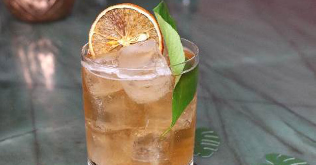 Alle Zutaten mit Würfeleis in den Cocktailshaker geben. Ca. 15 Sekunden kräftig shaken. Anschließend auf Eiswürfel in einem Tumbler doppelt abseihen. Rand des Tumblers mit einem Kaffir-Limettenblatt abreiben und zusammen mit einer gedörrten Orangenscheibe als Deko in das Glas geben.