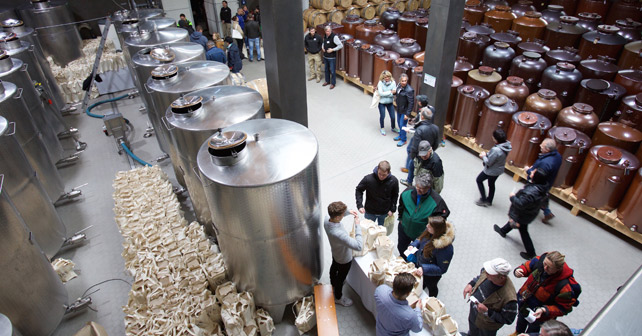 Bildzeile: Ein Blick in das Lager mit den wertvollen Steingutbehältern – hier werden die exklusiven Abfüllungen an die SLYRS-Fans übergeben.