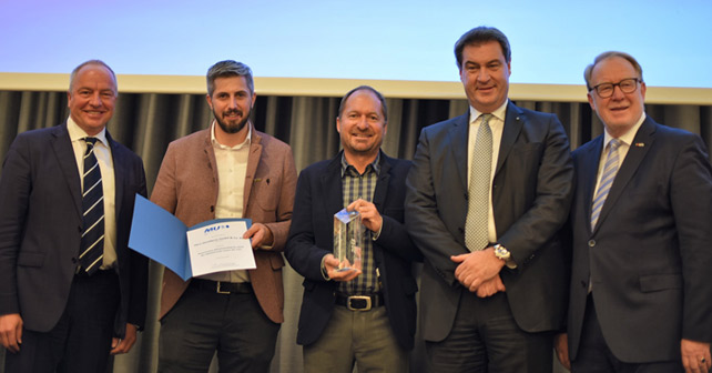 Bildzeile: Bei der Preisübergabe (v.l.): Bernhard Kösslinger, Hans Kemenater, Anton Stetter, Dr. Markus Söder und Dr. Hans Michelbach.