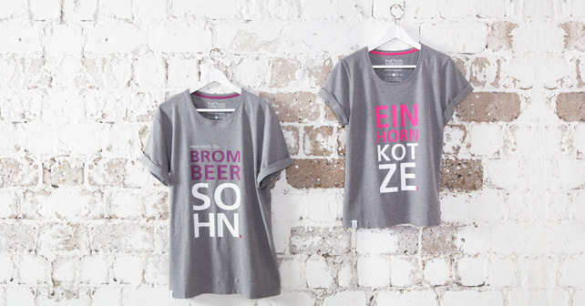 Wie kommt man aber dazu, jetzt auch noch T-Shirts anzubieten? Nun ja, bei true fruits werden eben alle Flaschen schön verpackt. Deshalb siebdruckt man die Wortneuschöpfungen, die sonst die Smoothie-Flaschen aufhübschen, ab sofort auf guten Stoff. Bei den zwei erhältlichen Motiven „Einhornkotze.“ und „Heul’ doch, Du Brombeersohn.“ handelt es sich um die zwei erfolgreichsten Flaschentexte, die die Flaschenrückseite der Smoothies verziert haben. Aber who-the-fruit ist denn jetzt eigentlich dieser „Brombeersohn“?