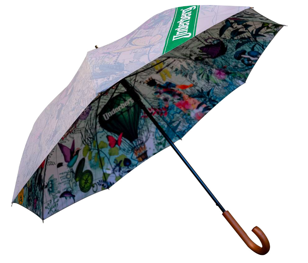 DER UNDERBERG REGENSCHIRM (für 384 Kapseln). Ein Automatik-Stockschirm mit Holz-Rundhakengriff und Schließband mit Klettverschluss gehört gleichfalls zu den neuen Artikeln im Prämienprogramm. Die Innenseite ist im „Pop-Art meets deutsche Romantik“-Stil ausgestaltet. Die Länge des Griffs beträgt ca. 96 cm und das geöffnete Schirmdach hat einen Durchmesser von ca. 112 cm. Damit ist der Underberg Regenschirm etwas größer als die „durchschnittlichen“ Stockschirme.