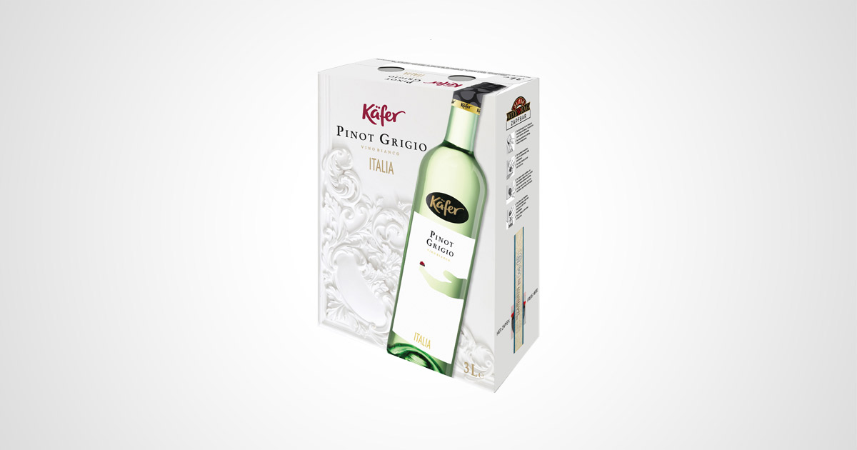 Noch mehr Vielfalt bietet das absatzstarke Italiensortiment der Lizenzmarke Käfer: Ab sofort verstärkt Käfer Pinot Grigio in der praktischen 3l BIB-Verpackung die Italien-Serie des Käfer Markenangebots.